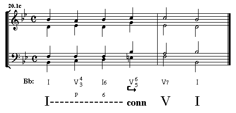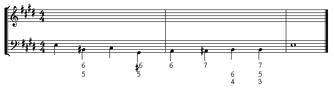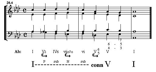 Note that beat 4 of measure 1 should have resolved to submediant, but went to subdominant instead. This deceptive resolution is usually a 3rd lower, but may, on rare occasions, resolve a 3rd higher than expected.