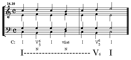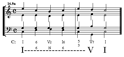 The first inversion of dominant has ^7 in the bass. If the bass moves ^1 - ^7 - ^1 (Do-Ti-Do), a neighbor motion is created. Therefore, the first inversion of dominant can prolong tonic as a NEIGHBOR CHORD (N). This works exactly the same with both the dominant triad and tetrad. Leading tone (^7), when located in the bass or soprano, must always resolve by step. When leading tone is in the alto or tenor, this resolution is preferable but not mandatory.
