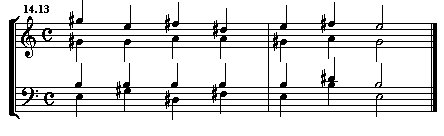 In the example below, even though there is a key signature of no accidentals, it is clear that it is not in C major because of all the sharps. Upon examination, the soprano and bass make it clear that it is in the key of E major, and is in fact exactly the same analysis as 14.12 above.