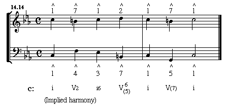 It is possible to determine the chordal motion in a piece of music by examining just the soprano and bass, which is called the IMPLIED HARMONIC PROGRESSION. Scale degrees found in the bass line imply specific harmonic actions, as seen in the vocabulary chart below. The soprano line confirms this, and make it more specific. For example, ^2 in the bass can imply either the leading tone in first inversion or the dominant 7 in second inversion (see below). If the soprano is ^4, that analysis is confirmed; if the soprano is ^5, it is also confirmed and further specified as dominant 7 in second inversion.