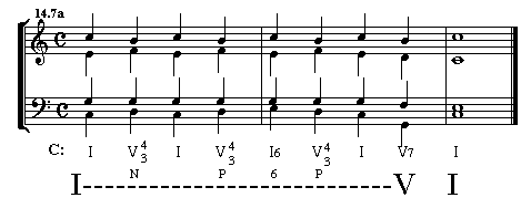As more and more complicated Roman numeral analyses are encountered, it is important to begin showing them in the simplest possible way. Never repeat the same Roman numeral back to back. The statement of a Roman numeral should always indicate that a harmonic change has taken place; if the same harmony is restated, the previous Roman numeral is still in effect.