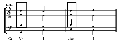 Since there is a likelihood for both the ^7 - ^8 and the ^2 - ^1 motions to occur, the resulting tonic can possibly have three roots (which includes the ^5 - ^1 in the bass). If this happens, the fourth voice must move to ^3 and omit ^5. This is one of the few times an incomplete triad can be found (see 14.3a below). Another solution is to have the middle voice move elsewhere (such as ^7 - ^5 or ^2 - ^3).