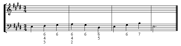 Add soprano, alto, and tenor lines to this figured bass, then provide a Roman numeral and structural analysis:
