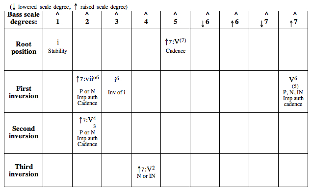 Note that the minor key chart presents two forms for ^6 and ^7 (lowered and raised).