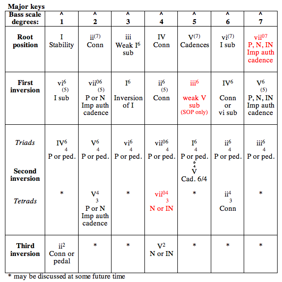 Tonic, dominant (7), supertonic (7), subdominant in several positions, leading tone in first inversion, all the 6/4 types, tonic substitutes (submediant and mediant), and dominant substitutes (leading tone 7 and mediant) [new items in red]
