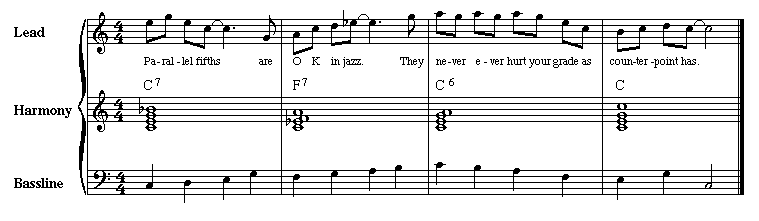 These three levels all work in counterpoint together, but the structure of that counterpoint is much more free than the Common Practice Period (as the lyrics imply, issues such as parallel perfect consonances are simply not a problem in this style).
