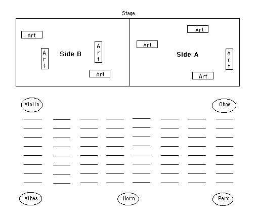 - The entire audience will be asked to come on stage to explore some artwork from up close and from many different angles. They will be told that the musicians will be providing background music. The audience should NOT be informed that they are going to be involved with the creation of the music.
