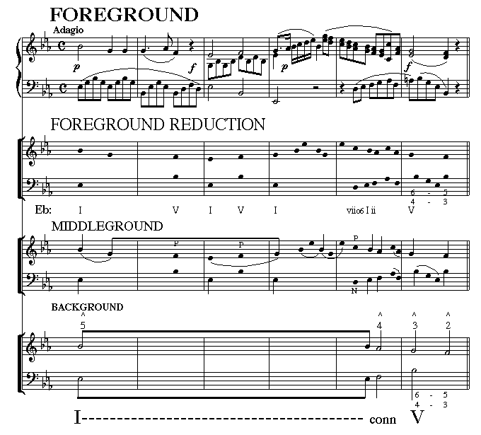 The background is generally represented by stemmed open noteheads (resembling half-notes) and is the most basic framework of the music; this level is reduced to only a few notes.