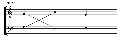 The VOICE EXCHANGE (also known by its German name, STIMMTAUSCH) is a frequently found technique of prolongation. Two voices, usually the soprano and bass, actually exchange pitches in a given harmony, which creates activity but does not change the harmonic area, thereby creating a prolongation. It is shown by connecting the like pitches with lines, which will create an "X".