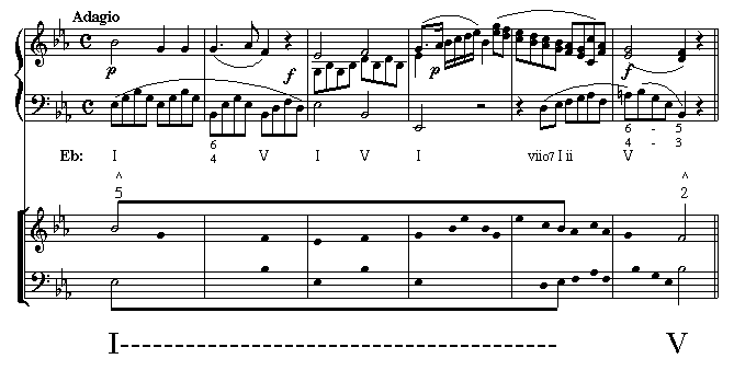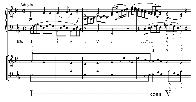 Continuing with the same Mozart excerpt, a Schenkerian graph is added. Below it are the procedural steps necessary to create this graph. Before you review the steps, locate the following parts: