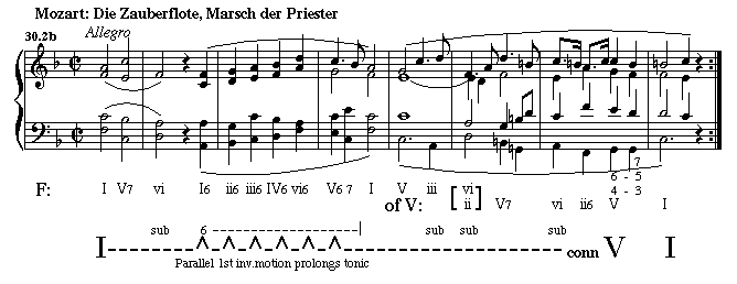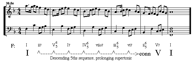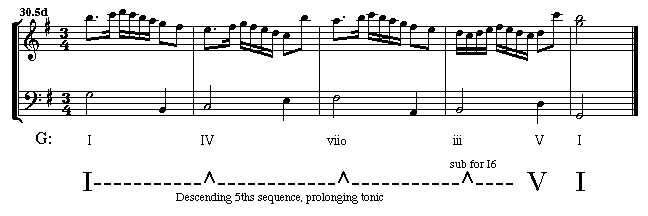 Notice in the structural analysis above that an arrow has been attached to the prolonging line to indicate the move from tonic to the cadence.