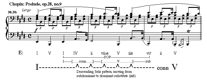 Notice in the excerpt above that the descending 3rds motion should have gone to tonic in the third measure but that Chopin elected to break the pattern with the tonic substitute.