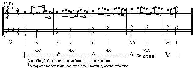 Certain repeated motions, particularly the ascending 2nds and descending 3rds, have the tendency to cause parallel perfect consonances. To avoid this, a VOICE LEADING CORRECTION (VLC) is interpolated to solve the problem. Although at first glance the harmonic pattern seems to be interrupted, the larger pattern is still there, generally on strong beats. Voice leading corrections can also be the goal of a sequence.